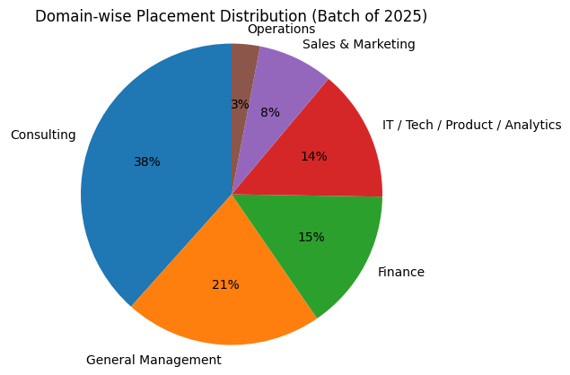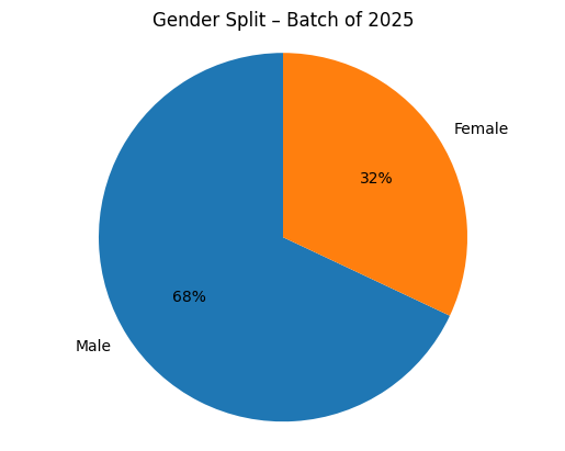 The table below presents a snapshot of the Batch of 2025 profile, covering gender composition, top institutes represented, and the distribution of work experience across the batch.